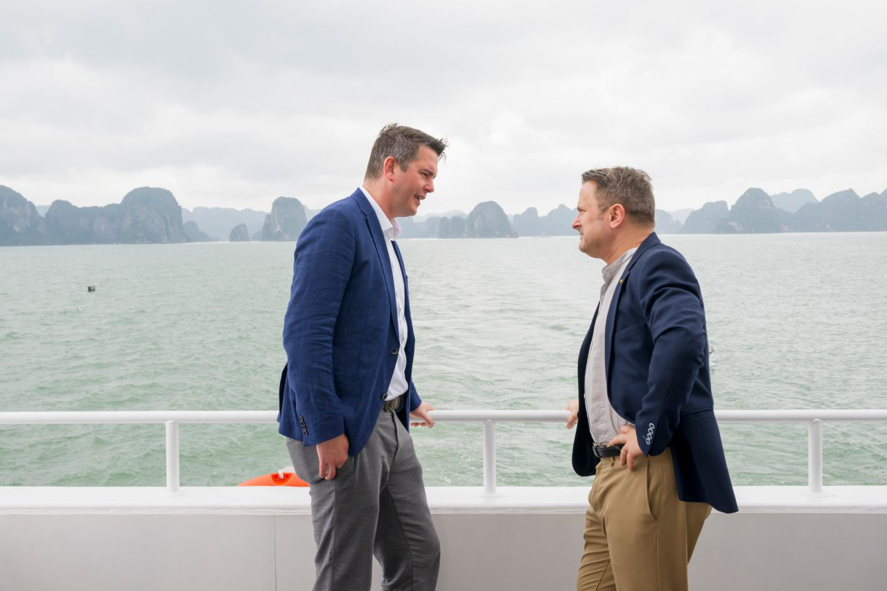Thủ tướng Xavier Bettel (bên phải) trò chuyện với Bộ trưởng Du lịch Luxembourg Lex Delles khi tham quan vịnh Hạ Long - Ảnh: Chính phủ Luxembourg