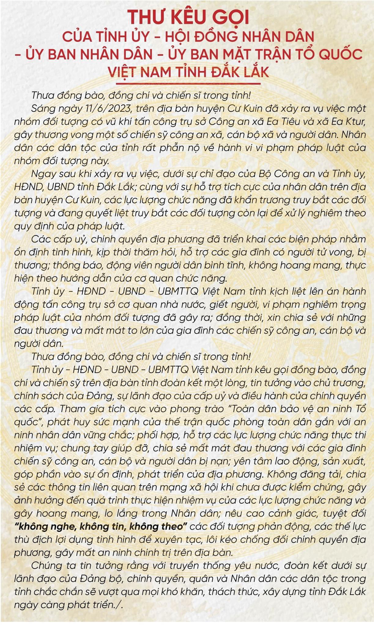 Nội dung thư kêu gọi nêu: Sáng 11-6, trên địa bàn huyện Cư Kuin đã xảy ra vụ việc một nhóm người có vũ khí tấn công trụ sở UBND xã Ea Tiêu và xã Ea Ktur, gây thương vong một số chiến sĩ công an xã, cán bộ xã và người dân.