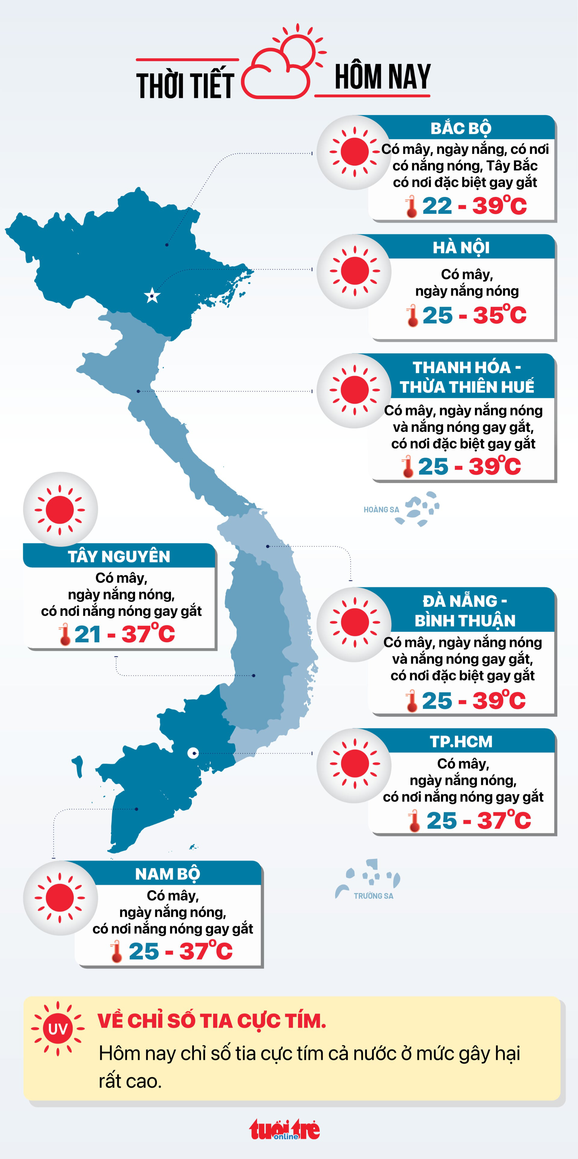 Thanh Hóa - Thừa Thiên Huế có mây, ngày nắng nóng và nắng nóng gay gắt, có nơi đặc biệt gay gắt. Nhiệt độ thấp nhất 25-28 độ C, cao nhất 35-39 độ C.