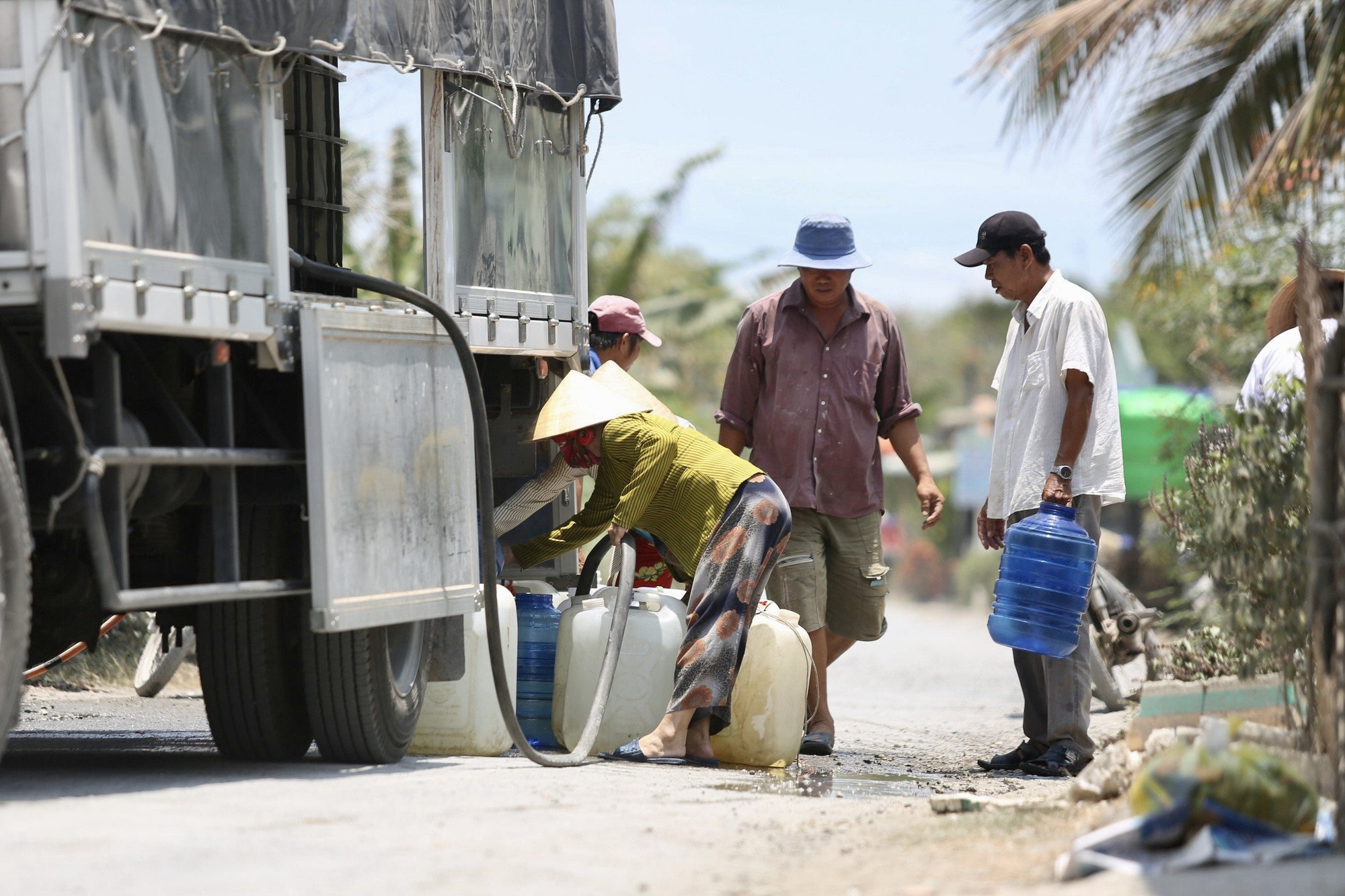 Do thời tiết nắng nóng kéo dài, xâm nhập mặn gay gắt, người dân tỉnh Tiền Giang xếp hàng lấy nước ngọt sinh hoạt - Ảnh: PHƯƠNG QUYÊN